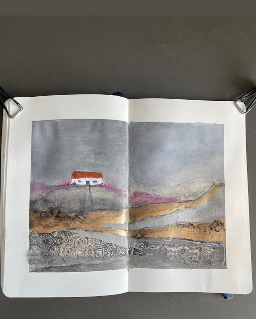 Ik heb veel verschillende materialen gebruikt zoals bedrukt papier, inkt, goudverf, oliepastel, Posca markers, acryl verf, gesso en houtskool. Al met al ben ik er een klein uurtje mee bezig.